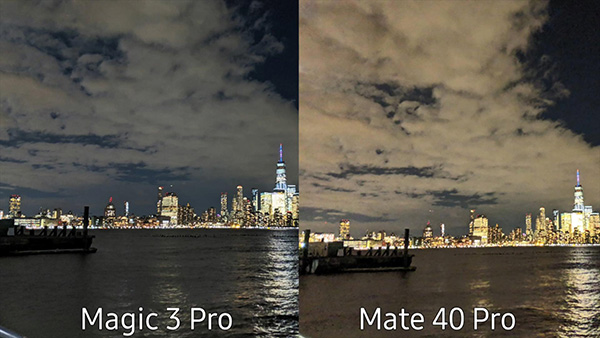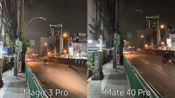 第三組照片的拍攝環(huán)境切換到了夜晚,馬路上的路燈都開著。對于夜拍的亮度表現(xiàn)一直是手機廠商追求的,而榮耀Magic3 Pro和華為Mate40 Pro也有著完全不同的表現(xiàn)。