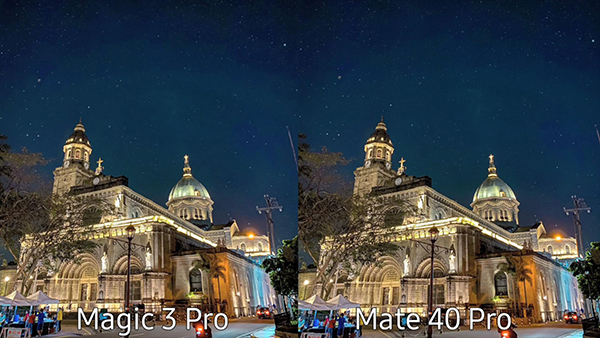 第四組照片依然是在夜間拍攝的,榮耀Magic3 Pro和華為Mate40 Pro之間的拍照效果十分接近,但是對于裝飾的燈光光暈的控制表現(xiàn),榮耀Magic3 Pro依然要更好一些。