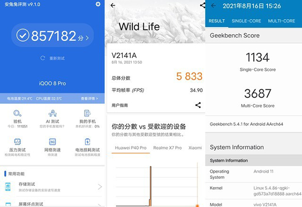 除了驍龍888 Plus外,iQOO 8 Pro還搭載了三星增強版的LPDDR5+UFS 3.1方案。其中增強版的LPDDR5內存較上一代LPDDR5速率提升16.3%,應用調取與緩存速度更快;而增強版V6 UFS 3.1 速度同樣更快卡頓更少,相對上一代V5 UFS 3.1順序讀取速度提升6.4%,順序寫入速度提升5.89%,隨機寫入速度提升17.3%。因而iQOO 8 Pro能夠取得高達857182的安兔兔跑分,驍龍888 Plus+增強版LPDDR5/UFS 3.1這一組新的“性能鐵三角”功不可沒。