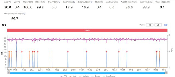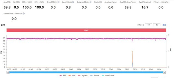 可以看出,iQOO 8 Pro在HDR高清+極限幀率條件下運(yùn)行《和平精英》游戲時(shí)幀率可以達(dá)到59.8幀,整條幀率曲線較為平緩,游戲運(yùn)行十分流暢且無掉幀等情況;而在高幀率超高畫質(zhì)且開啟極致畫面質(zhì)量的條件下運(yùn)行《王者榮耀》時(shí)平均幀率為60幀,運(yùn)行過程同樣十分流暢;以中畫質(zhì)條件下運(yùn)行大型手游《原神》時(shí)幀數(shù)為30幀,曲線也不會(huì)有太大的波動(dòng),不過長時(shí)間運(yùn)行中偶爾會(huì)出現(xiàn)卡頓的情況??傮w來看,iQOO 8 Pro在運(yùn)行這三款游戲時(shí)不會(huì)有太大壓力,整體表現(xiàn)較佳。
