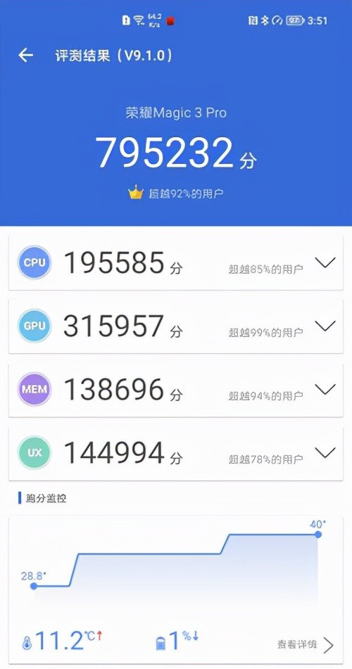 從結(jié)果來(lái)看,榮耀Magic3 Pro的安兔兔跑分為795232分,超越了92%的用戶(hù)。其中,CPU得分為195585分,GPU得分為315957分,UX得分為144994分,MEM得分為138696分。我們拿到的Magic3 Pro是8GB+256GB版本,在安兔兔公布的7月份Android手機(jī)排行榜中位列第九,在一眾12GB+256GB版本的隊(duì)伍中頗為顯眼。