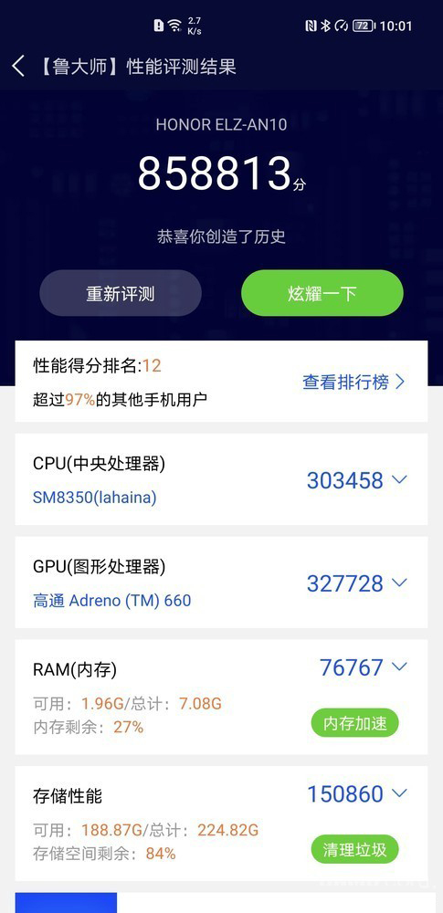 在魯大師跑分中,榮耀Magic3 Pro的分?jǐn)?shù)達(dá)到了858818分,性能得分排名12,超越了97%其它手機(jī)用戶(hù)。其中,CPU得分303458分,GPU得分327728分,RAM得分76767分,存儲(chǔ)性能得分150860分。整體來(lái)看,榮耀Magic3 Pro的性能是非常頂級(jí)的,面對(duì)市面上各類(lèi)旗艦產(chǎn)品,均有著不俗的優(yōu)勢(shì)。