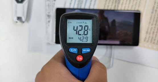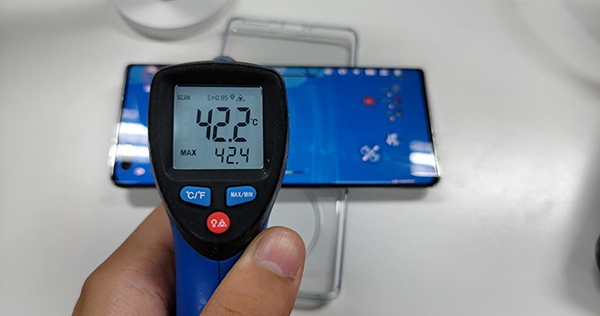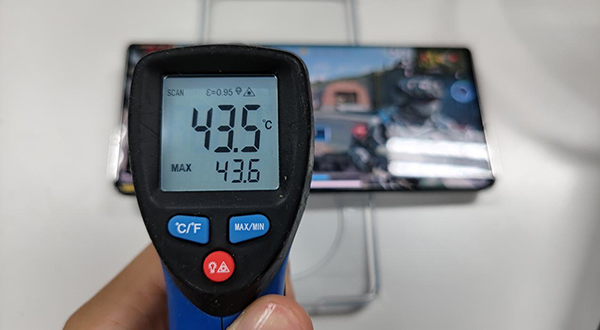 室溫27℃,在烤機(jī)進(jìn)入白熱化階段時(shí),正面最高溫度也僅約42.9℃,有熱感,但不至于燙手。