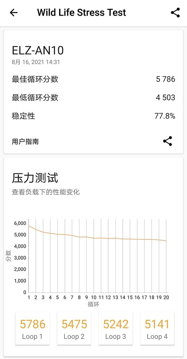 從最后的得分曲線來看,即便是最低點(diǎn)也仍然保留了近80%的性能,可以說榮耀的確有對旗艦級處理器做針對性的優(yōu)化,最終最高分5786,最低分4503。