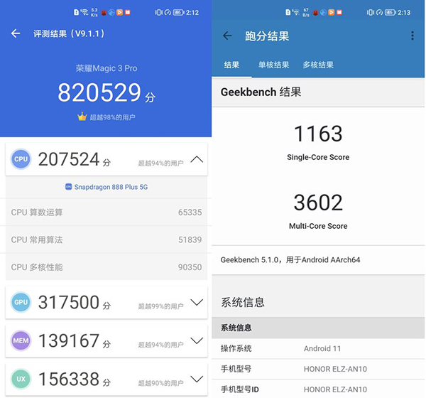手機(jī)開(kāi)啟性能模式,搭載驍龍888 Plus的榮耀Magic3 Pro在安兔兔V9.1.1中獲得總分82萬(wàn),相比起大多數(shù)驍龍888機(jī)型80萬(wàn)左右的平均分要略高些。在GeekBench單核/多核的得分分別為1163和3602,在單核性能上有小幅提升。