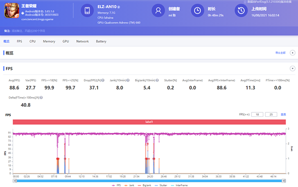 可以看到,除了兩次返回大廳界面時(shí)產(chǎn)生的幀率波動(dòng)外,每一局游戲內(nèi)的幀率曲線都緊貼90 FPS,足見(jiàn)榮耀Magic3 Pro的性能駕馭《王者榮耀》毫無(wú)問(wèn)題,用它玩起一些比較考驗(yàn)微操的英雄也是得心應(yīng)手。