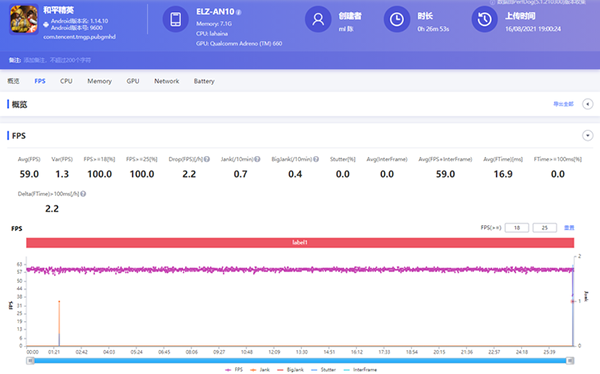 接下來(lái)是《和平精英》,畫(huà)質(zhì)選擇「HDR高清+極限+抗鋸齒開(kāi)+陰影開(kāi)」,測(cè)試單人匹配海島地圖接近30分鐘。從結(jié)果看,游戲幀率也達(dá)到了59FPS,同樣是幾乎拉成了一條直線,實(shí)際游戲過(guò)程是完全流暢的。