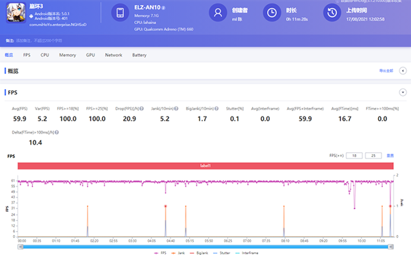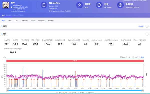 最后是熱門游戲中負(fù)載最高的《原神》,在這款游戲中,大多數(shù)手機(jī)即使游戲前期能保持不錯(cuò)的幀率,短時(shí)間的高負(fù)載后也會(huì)容易出現(xiàn)明顯的表現(xiàn)下滑。我們選擇預(yù)設(shè)高畫(huà)質(zhì),并手動(dòng)開(kāi)啟60FPS模式,測(cè)試地圖為夜晚的璃月港30分鐘跑圖。