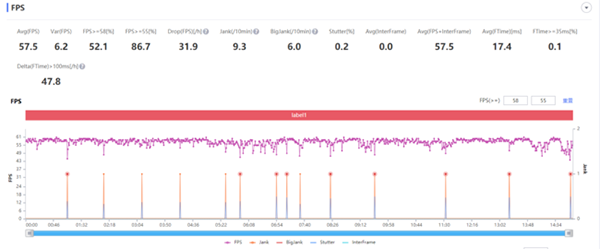 接下來(lái)直接測(cè)試0優(yōu)化的《原神》,依舊是開(kāi)啟最高檔位畫(huà)質(zhì),ROG游戲手機(jī) 5s Pro讓我真正意義上高幀流暢體驗(yàn)了一把什么叫游戲體驗(yàn),平均幀率達(dá)到57.5幀,平均jank達(dá)到9.3,有超過(guò)55%的時(shí)間幀率大于86.7幀,表現(xiàn)讓人震驚。