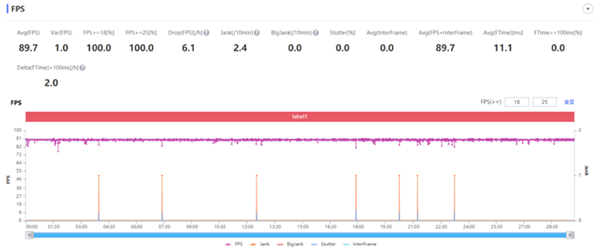 在開(kāi)啟高畫(huà)質(zhì)+90FPS時(shí),騰訊ROG游戲手機(jī) 5s Pro幀率圖穩(wěn)如老狗,平均幀率高達(dá)89.7,每10分鐘jank僅有2.4,平均抖動(dòng)僅有1幀,表現(xiàn)非常出色,在30分鐘《和平精英》游戲后,機(jī)身溫度已經(jīng)開(kāi)始起來(lái)了,但也只是溫手,大部分熱量依舊集中到邊框部分。