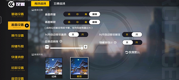 作為支持120Hz射擊類游戲的《王牌戰(zhàn)場》,我們當(dāng)然也要拉滿試試性能,把游戲畫質(zhì)拉到最高,關(guān)掉自動降低畫質(zhì)和幀率。