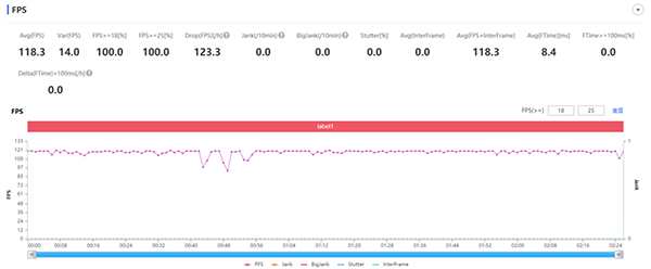 在游戲表現(xiàn)中,游戲戰(zhàn)局內(nèi)平均幀率為118幀,同樣的,F(xiàn)PS曲線波動并不是很大。
