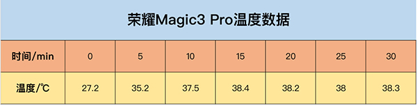 可以看到的是,在游戲開始后,榮耀Magic3 Pro的機身溫度迅速上升,五分鐘時達到35.2℃,10分鐘達到了37.5℃,手機在運行至15分鐘左右時達到溫度峰值38.4℃,此后手機溫度基本徘徊在38℃左右,這樣的溫度確實算不上熱,可以令用戶時刻“清涼出戰(zhàn)”。
