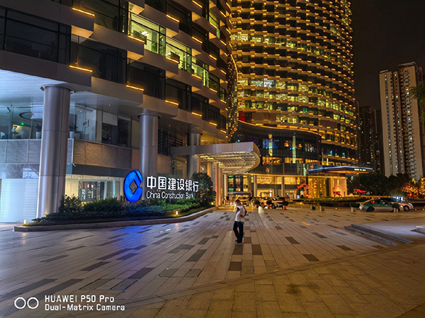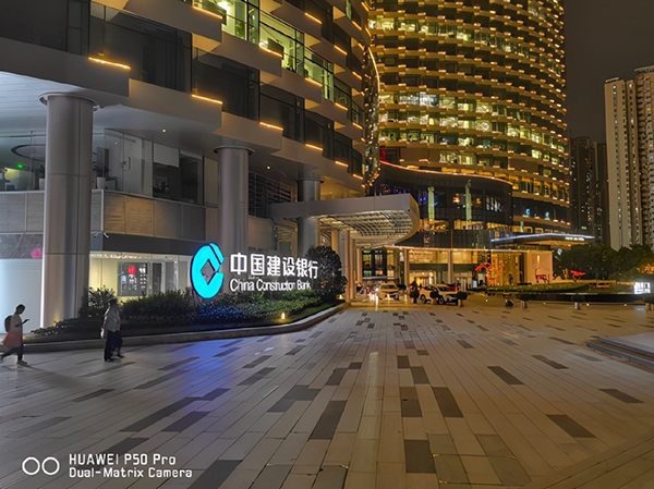 華為P50 Pro主攝夜景樣張:在夜景暗光環(huán)境下,依靠黑白鏡頭的優(yōu)勢,能有更好的畫面亮度,同時保證亮部不過曝,暗部有細(xì)節(jié),像是近處的中國建設(shè)銀行LOGO的藍色就能很真實地保留下來,這就是原色攝影的威力?