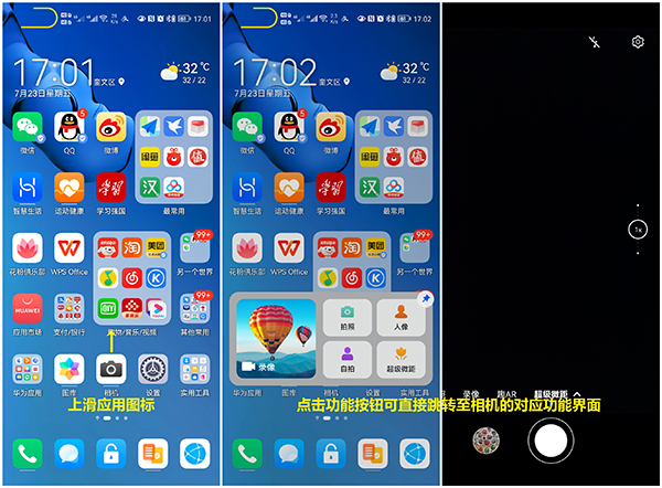 1、上滑桌面上帶有提示條(下劃線)的應(yīng)用圖標,以呼出該應(yīng)用的服務(wù)卡片。點擊上滑呼出的卡片,可直接進行相關(guān)操作或跳轉(zhuǎn)至應(yīng)用的相關(guān)界面。如下圖所示:(以“相機”為例,點擊功能按鈕可直接跳轉(zhuǎn)至相機的對應(yīng)功能界面)