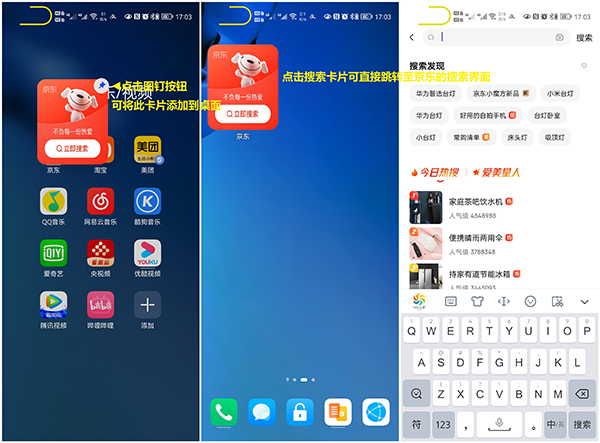 2、上滑應(yīng)用圖標呼出服務(wù)卡片后,點擊卡片右上角的圖釘按鈕,可將此卡片添加到桌面。在桌面上點擊卡片,可直接進行相關(guān)操作或跳轉(zhuǎn)至應(yīng)用的相關(guān)界面。如下圖所示:(以“京東”為例,點擊搜索卡片可直接跳轉(zhuǎn)至京東的搜索界面)
