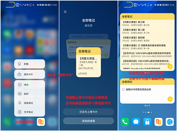 3、長按桌面上帶有提示條(下劃線)的應(yīng)用圖標,點擊“服務(wù)卡片”,可選擇上滑卡片的大小和樣式,還可向桌面添加多個樣式的卡片。如下圖所示:(以“備忘錄”為例,可在桌面上顯示筆記和待辦,點擊卡片可進入編輯界面)