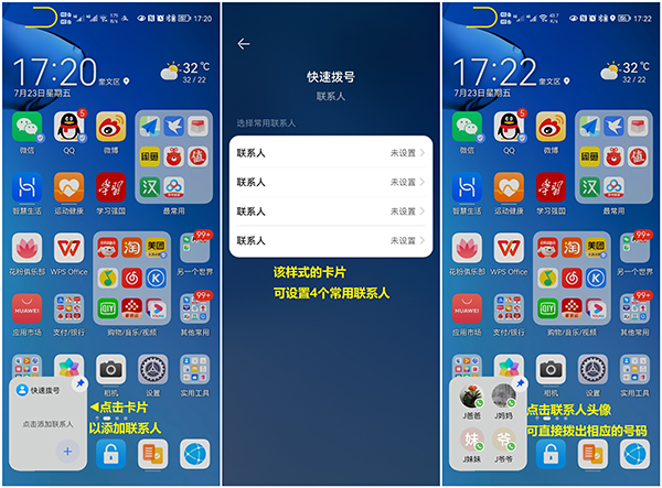 4、部分服務(wù)卡片需要設(shè)置后才可快速跳轉(zhuǎn)至應(yīng)用的相關(guān)界面。如下圖所示:(以“電話”為例,設(shè)置聯(lián)系人后可直接撥出相應(yīng)的號碼)