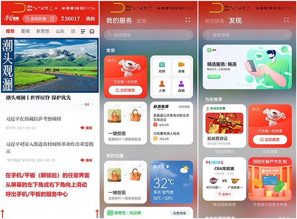 5、在手機(解鎖后)的任意界面,從屏幕的左下角或右下角向上滑動,可呼出手機的服務(wù)中心。服務(wù)中心是各種服務(wù)卡片的集結(jié)地,包括單純的服務(wù)卡片也會在此顯示。如下圖所示:
