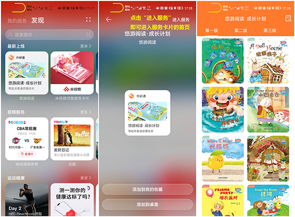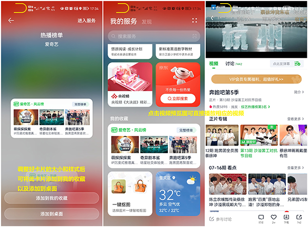 7、點擊“發(fā)現(xiàn)”界面的服務(wù)卡片,調(diào)整好卡片的大小和樣式后(僅部分卡片有多個樣式),可將此卡片添加到我的收藏,以及添加到桌面。在服務(wù)中心或桌面上點擊卡片,可直接進行相關(guān)操作或跳轉(zhuǎn)至應(yīng)用的相關(guān)界面。如下圖所示: