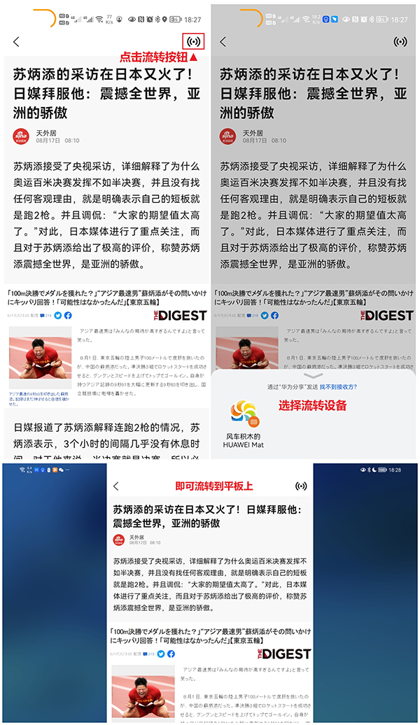 8、部分服務(wù)卡片還具備在多設(shè)備之間流轉(zhuǎn)的能力。如下圖所示:(以“新浪新聞鴻蒙版”為例,打開新聞資訊后,點擊右上角的流轉(zhuǎn)按鈕,即可流轉(zhuǎn)到附近的鴻蒙手機/平板上(設(shè)備雙方均需打開華為分享開關(guān)))