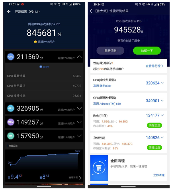 這款騰訊ROG游戲手機(jī)5s Pro在魯大師的跑分中獲得了945528的高分“創(chuàng)造了歷史”,性能排分第一名。888Plus的分?jǐn)?shù)達(dá)到了320624,GPU得分349901,很是囂張。