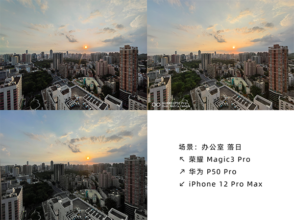 在這一組照片當(dāng)中,華為P50 Pro的天看起來更紅,更有落日的整體感覺,有些發(fā)力過猛;iPhone 12 Pro Max對(duì)天空的處理不錯(cuò),但是房屋偏暗;榮耀Magic3 Pro的成片偏素,對(duì)畫面整體的感覺控制的比較好。