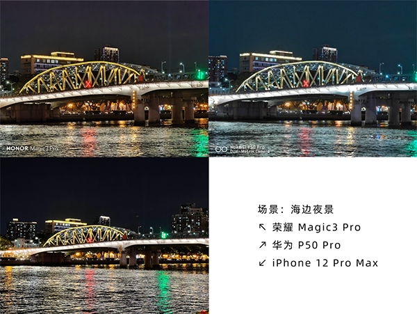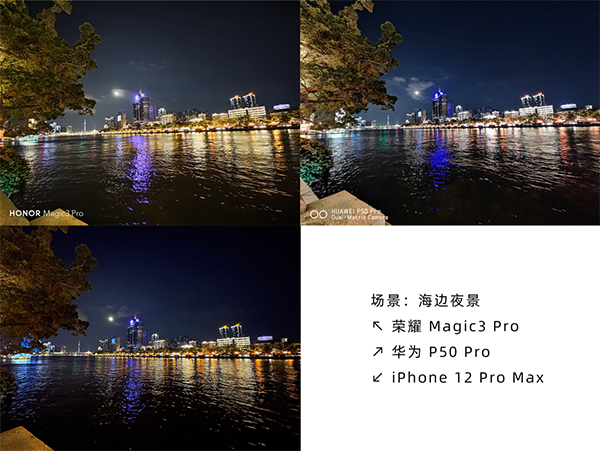 在使用超廣角攝像頭拍攝海邊的夜景時(shí),榮耀Magic3 Pro出現(xiàn)了畫面偏白的情況,色調(diào)與iPhone 12 Pro Max接近。華為P50 Pro與iPhone 12 Pro Max除了色調(diào)不同之外,整體表現(xiàn)接近。