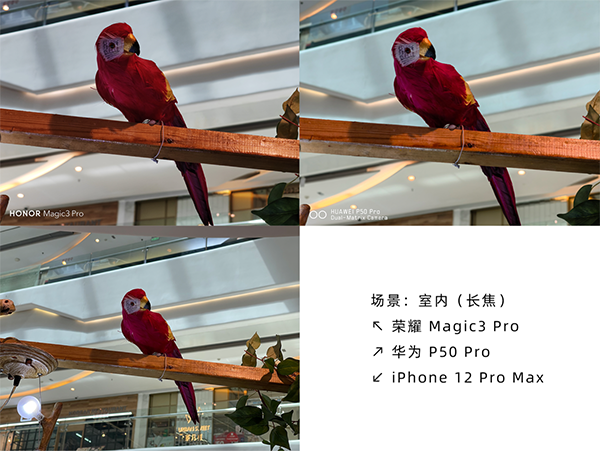 接下來是一組室內(nèi)長焦,這里榮耀Magic3 Pro與華為P50 Pro均為默認(rèn)的3.5倍,而蘋果還是吃了2.5倍長焦的虧。在實(shí)際觀感上面,榮耀Magic3 Pro的成片顏色偏深,亮度稍微暗一些,不過層次感更好;華為P50 Pro的成像更亮一些,背景稍微有些偏色。