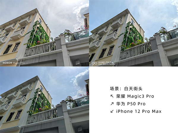 不過榮耀Magic3 Pro對(duì)樓房的處理更好,相比之下華為P50 Pro與iPhone12Pro的房屋墻面都多少被天空帶了一些顏色上去。