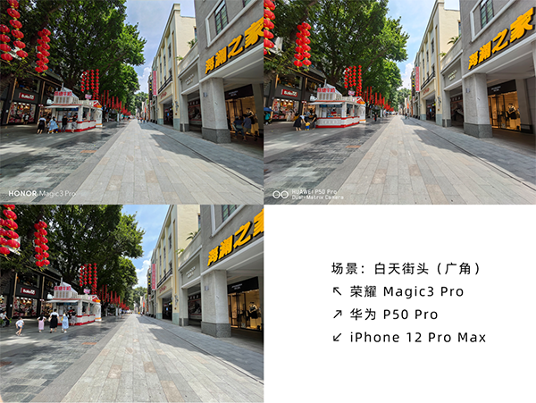 走出商場后的街頭隨拍,這里iPhone 12 Pro Max與華為P50 Pro拍出來的天空偏藍(lán),榮耀Magic3 Pro則有多云的感覺。實(shí)際的天空情況介于兩種風(fēng)格之間,比P50 Pro拍出的效果要更淡一些。