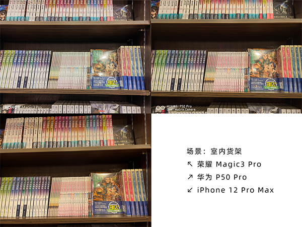 然后跑去書店,因?yàn)榕恼盏臅r(shí)候有點(diǎn)緊張所以iPhone 12 Pro Max的視角不太對(duì),就只當(dāng)客串了。在這里可以看出榮耀Magic3 Pro拍出的書更白更亮,符合新書的質(zhì)感,而華為P50 Pro則為整個(gè)畫面添加了一層濾鏡,仿佛來到了老書區(qū),不過對(duì)文字的記錄更好。