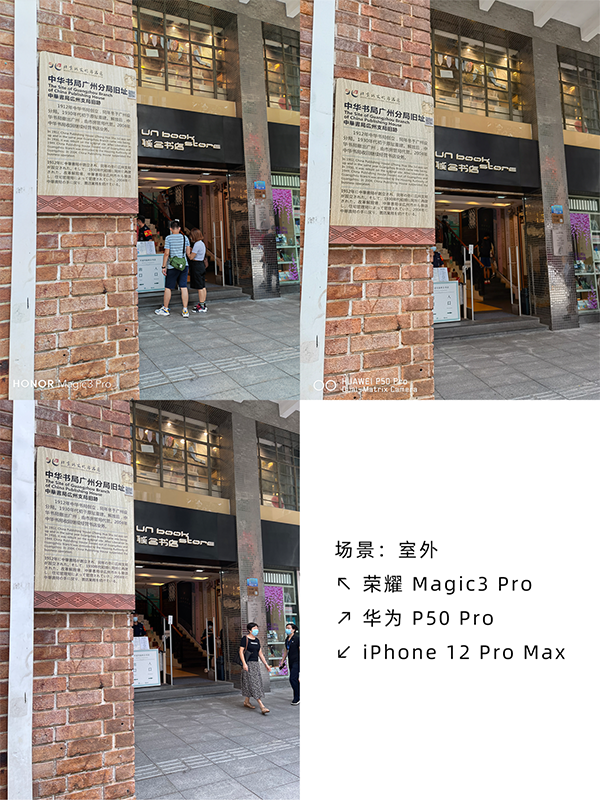 必須要承認(rèn)的是,三款產(chǎn)品的表現(xiàn)都十分優(yōu)秀,不過角落處也都有一些畸變現(xiàn)象。相比之下榮耀Magic3 Pro對(duì)高光的處理更好一些,較遠(yuǎn)處「新華書店」的牌子看起來更真實(shí)。