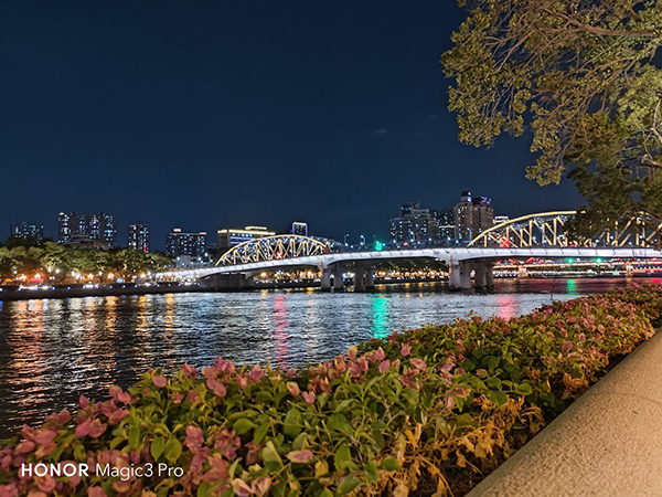 可以看到榮耀Magic3 Pro在使用超廣角鏡頭拍攝夜景時,除了遠(yuǎn)處密集燈帶會產(chǎn)生一點泛光,其他位置的內(nèi)容(包括水面)的細(xì)節(jié)都得到了有效的保留,天空與水面的噪點也被控制到了比較合理的范圍內(nèi)。