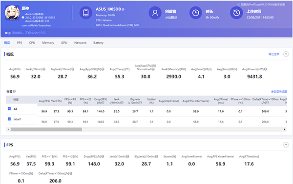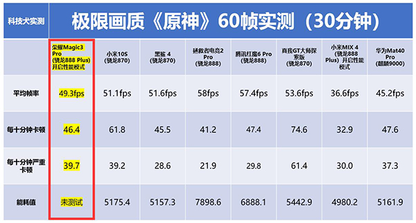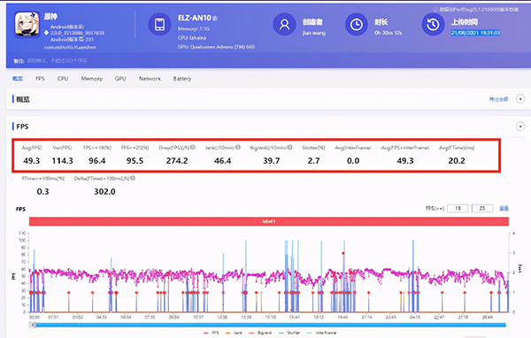 榮耀Magic3 Pro全特效60幀模式《原神》實測,測試人物等級50級,打四個日常然后跑圖打隨機怪(與ROG游戲手機5s Pro測試的方法一致),測試時長30分鐘,特效全開并開啟60幀模式,同時開啟手機性能模式,具體成績?nèi)缦聢D所示: