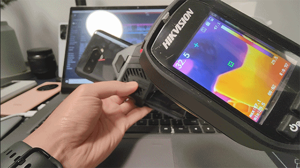使用熱成像儀進行溫度實測,如圖所示,ROG游戲手機5s Pro的機身發(fā)熱主要出現(xiàn)在左右邊框、頂部邊框、屏幕左下角(橫向握持狀態(tài),挖孔方向居于左手),主要熱源集中分布在屏幕左下角區(qū)域。