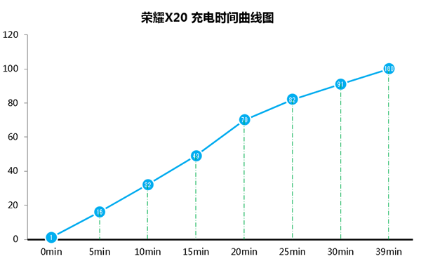 這次實(shí)際上,我從1%電量開(kāi)始充電,充電15分鐘后充進(jìn)了49%的電量,20分鐘充電達(dá)到了70%,39分鐘左右就可以讓榮耀X20充到100%電量。