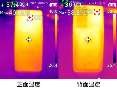 在無線充電過程中,iQOO 8 Pro的溫度控制也相當(dāng)不錯。在無線充電10分鐘后(此時的充電平均功率最高,機身溫度已經(jīng)達(dá)到最高點),我們對iQOO 8 Pro進(jìn)行了測溫,機身正面溫度最高處達(dá)到了40度。機身背部的高溫區(qū)域則是處理器與無線充電線圈部分,其中處理器區(qū)域的溫度最高,達(dá)到了38.8度。至于為何機身背部的溫度要比正面還低,我們推測是由于背部與底座之間是具有一條風(fēng)道的,能夠持續(xù)的進(jìn)行風(fēng)冷散熱,因此溫度上相比正面還低。