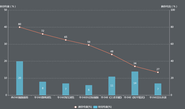 在電量完全充滿之后,我們開始連續(xù)不斷地進行:兩小時視頻觀看、半小時微博瀏覽、半小時淘寶瀏覽、半小時抖音短視頻觀看、半小時《王者榮耀》游玩、半小時《和平精英》游玩、半小時音樂播放。