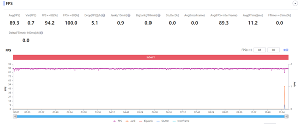 實(shí)測(cè)iQOO 8可以輕松保持全程幀率穩(wěn)定如一條直線(xiàn),平均幀率89.3FPS,波動(dòng)僅0.7,100%幀率維持在80FPS以上,操控體驗(yàn)非常順滑。