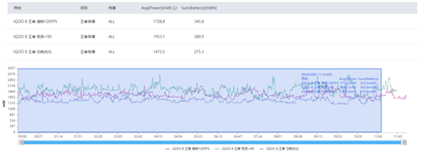 從軟件記錄數(shù)據(jù)來(lái)看,三種模式下的平均功率排序?yàn)?原生90幀>提升幀率 120幀>優(yōu)化功耗 90幀,翻倍后計(jì)算,最高最低二者平均功率差了961.2mW,而節(jié)選同等時(shí)長(zhǎng)范圍(開(kāi)始至11分12秒),二者的總功耗差了177.4mWh,功耗優(yōu)化帶來(lái)的提升還是非常明顯的。