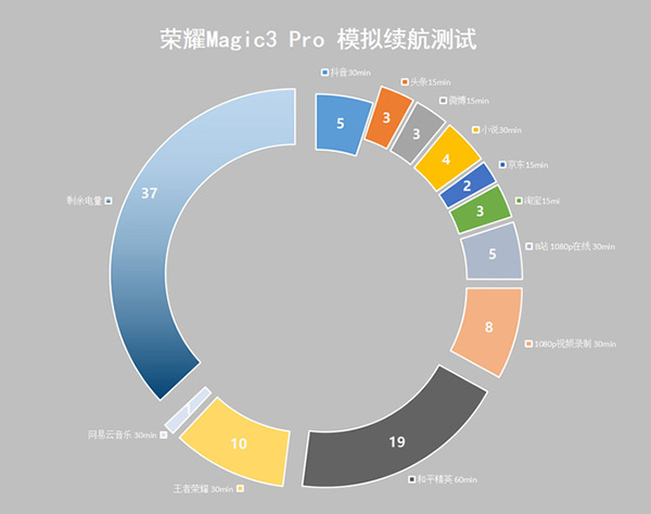 實(shí)測結(jié)果如下圖所示,經(jīng)過了5個(gè)小時(shí)的重度續(xù)航模擬測試后榮耀Magic3 Pro剩余電量還剩37%,這意味著榮耀Magic3 Pro應(yīng)對一天日常使用是完全沒有問題的。