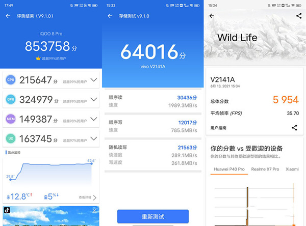 性能方面,iQOO 8 Pro安兔兔綜合測(cè)試成績(jī)超過85萬分,存儲(chǔ)測(cè)試得分超過6萬分,3DMark測(cè)試成績(jī)超過5900分。從基準(zhǔn)測(cè)試的分?jǐn)?shù)來看,該機(jī)的性能表現(xiàn)處于目前智能手機(jī)的頂點(diǎn)。
