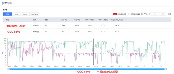 如上圖中,開啟VRS功能后,iQOO 8 Pro的的平均幀數(shù)達(dá)到97.7幀,游戲全程均在120幀模式下進(jìn)行渲染。另一款同樣采用驍龍888 Plus的手機(jī),手動(dòng)關(guān)閉VRS模式,在游戲初期的幀數(shù)均已經(jīng)落后iQOO 8 Pro,5分鐘的游戲后,由于芯片負(fù)載太高,幀數(shù)被鎖定到了60幀,最終全程平均幀數(shù)僅有64.4幀,大幅落后iQOO 8 Pro。