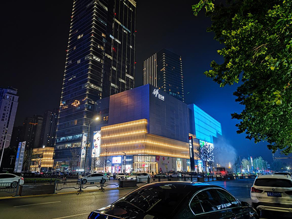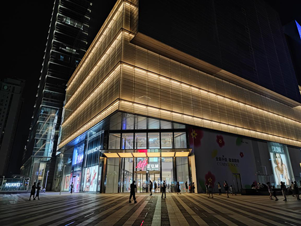 接下來是暗光場景的表現,夜景是HMX的弱項,但是得益于不錯的夜景算法,MIX4的夜景照片還是相當純凈的,整個畫面噪點很少,亮度的細節(jié)也保留的不錯,我們可以看到上面的燈箱線條細節(jié)相當清晰,商場內的商店標牌也可以看的比較清楚。