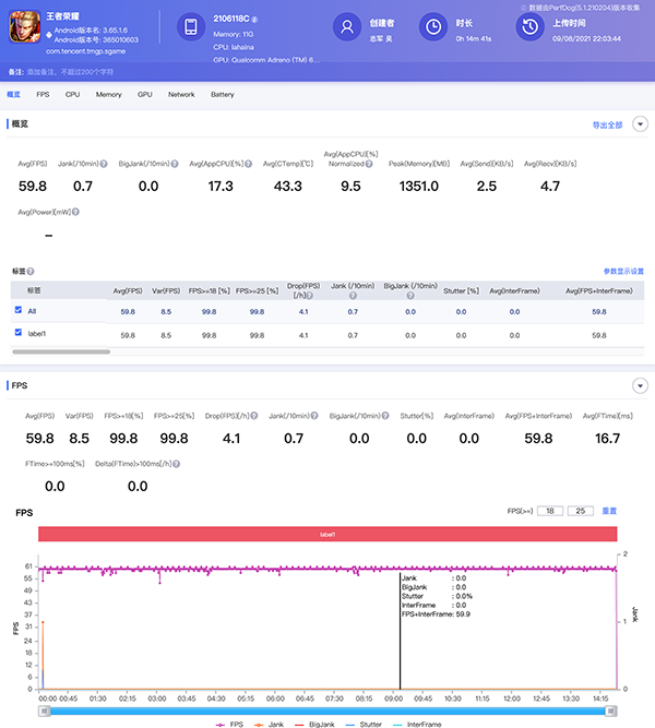 抱著專業(yè)的心態(tài),我也用PerfDog跑了跑主流游戲的幀率,畢竟再不跑,以后PerfDog就要收費(fèi)了,淚目!王者、吃雞、原神都跑了一遍,整花了兩個(gè)小時(shí),看下圖: