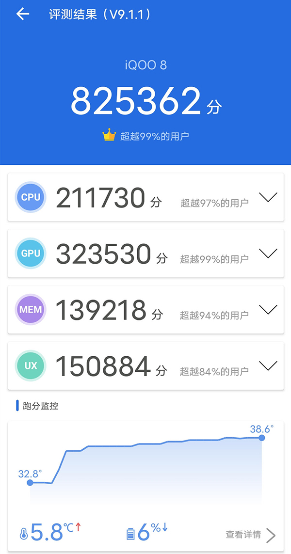 此次iQOO 8搭載的核心硬件有驍龍888 芯片、LPDDR5和UFS 3.1,都是現(xiàn)階段市場(chǎng)上的旗艦級(jí)硬件配置,能夠有效提升手機(jī)的性能實(shí)力、運(yùn)存速率以及數(shù)據(jù)處理能力等等。我特意用安兔兔軟件測(cè)了一下這款手機(jī)的跑分,沒(méi)想到它能拿下82萬(wàn)+的超高跑分成績(jī),這已經(jīng)達(dá)到了行業(yè)第一梯隊(duì)的性能實(shí)力。強(qiáng)悍的性能可以保證手機(jī)流暢運(yùn)行大型手游,在這個(gè)基礎(chǔ)上,iQOO 8又加入了許多軟硬件配置進(jìn)一步優(yōu)化了游戲表現(xiàn)。它搭載了120Hz 高刷屏、獨(dú)立顯示芯片、立體雙揚(yáng)聲器、雙X軸線性馬達(dá)以及VC 動(dòng)力泵液冷散熱等配置,同時(shí)還支持專屬電競(jìng)天線設(shè)計(jì)、屏下雙控壓感等等,能夠從觀感、手感、聽(tīng)感等多個(gè)方面提升用戶的游戲體驗(yàn)。