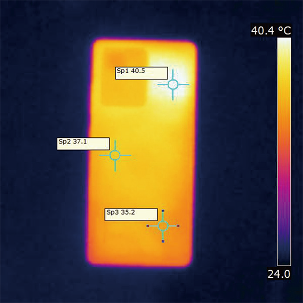 多擋控溫策略最終帶來了出色的功耗控制表現(xiàn)。在過去的多次評測中,驍龍888機(jī)型運(yùn)行《原神》半小時(shí)后,機(jī)身溫度通常可以達(dá)到50℃以上,發(fā)熱比較明顯,而大核主頻更高的驍龍888 Plus是不是更難以控制?非也。小米MIX4在內(nèi)部散熱部件上不惜成本,配備了用石墨烯制成的1206平方毫米的3 D石墨烯均溫板,完全覆蓋了處理器和主板周邊的主要發(fā)熱區(qū)域。半小時(shí)《原神》游戲結(jié)束后,我們使用熱成像儀測量機(jī)身表面溫度分布。在24℃室溫下小米MIX4機(jī)身表面最高溫度為40.5℃,而其他區(qū)域的溫度都在33℃~37℃左右,摸上去與體溫接近。