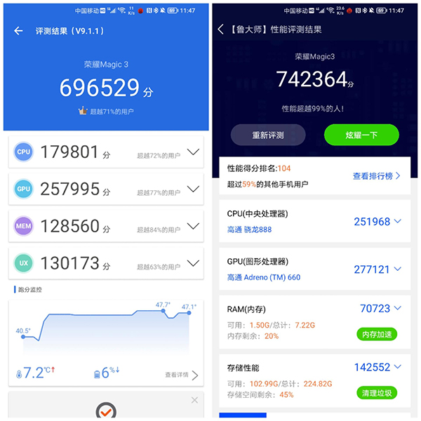 榮耀Magic3搭載的處理器為基于5nm先進(jìn)制程工藝的高通驍龍888處理器, 在性能和Ai算力上有著明顯的提升,參考安兔兔的跑分為696529分 ;魯大師的跑分?jǐn)?shù)據(jù)為742356分,跑分如此之高,就可以看得出來(lái)這代驍龍888處理器究竟都多猛了。