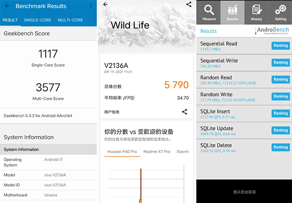 在其余的3D Mark、GeekBench、AndroBench等測試平臺上,它也具備了不錯的成績。也就意味著,iQOO 8能在日常用機上給予我們旗艦的順暢表現(xiàn)。